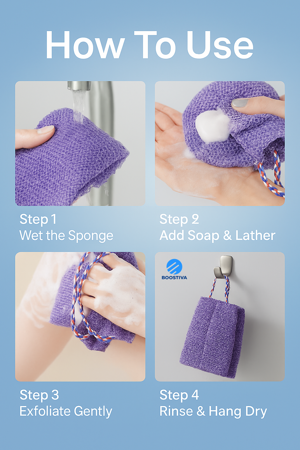 A2: After each use, rinse with warm water and hang by the loop to dry quickly. For a deeper clean, it’s machine washable (use a laundry bag, gentle cycle). To keep it fresh, replace every 2–3 months depending on use.